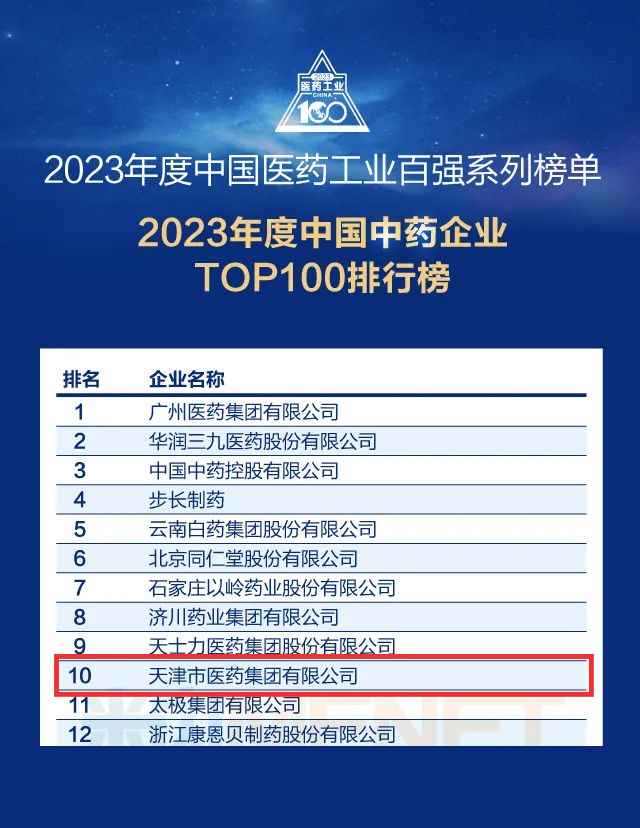 集团荣获“2023年度中国中药企业TOP100排行榜”TOP10企业称号