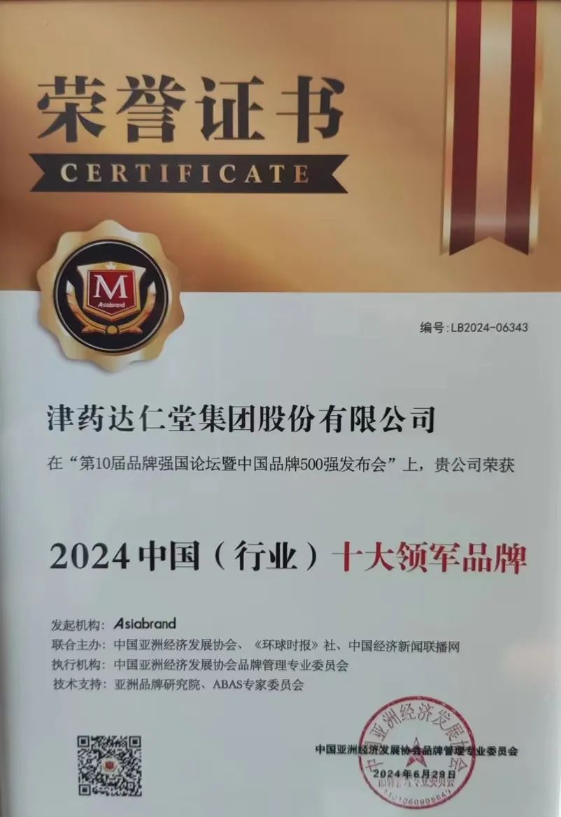 津药达仁堂集团荣膺“2024中国品牌500强”、“中国(行业)十大领军品牌”两项殊荣。这既是对津药达仁堂品牌综合实力、市场影响力及发展潜力的认可,也是对津药达仁堂品牌建设与贡献给予的高度评价。